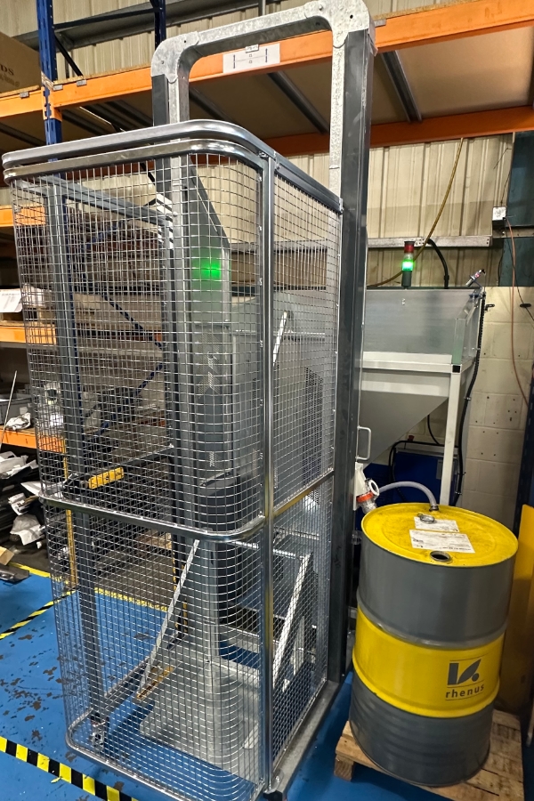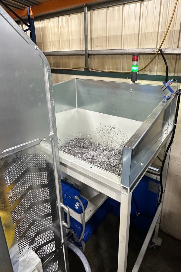 The Drurys machine has been commissioned with an extended hopper giving 550 litres of swarf storage into the machine and a bespoke bin lifter manufactured to suit Drurys’ swarf bins.